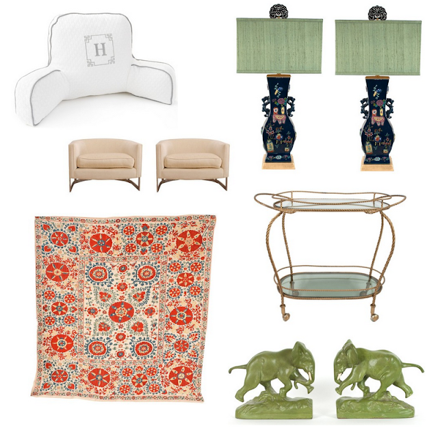 My Boyfriend's Back Pillow (available with initial or without) | Pair of Blue Dragon Handle Base Lamps with Grace Finial | Pair of Milo Baughman Chairs | Vintage Gold Tea/Bar Cart | Suzani | Green Elephant Bookends